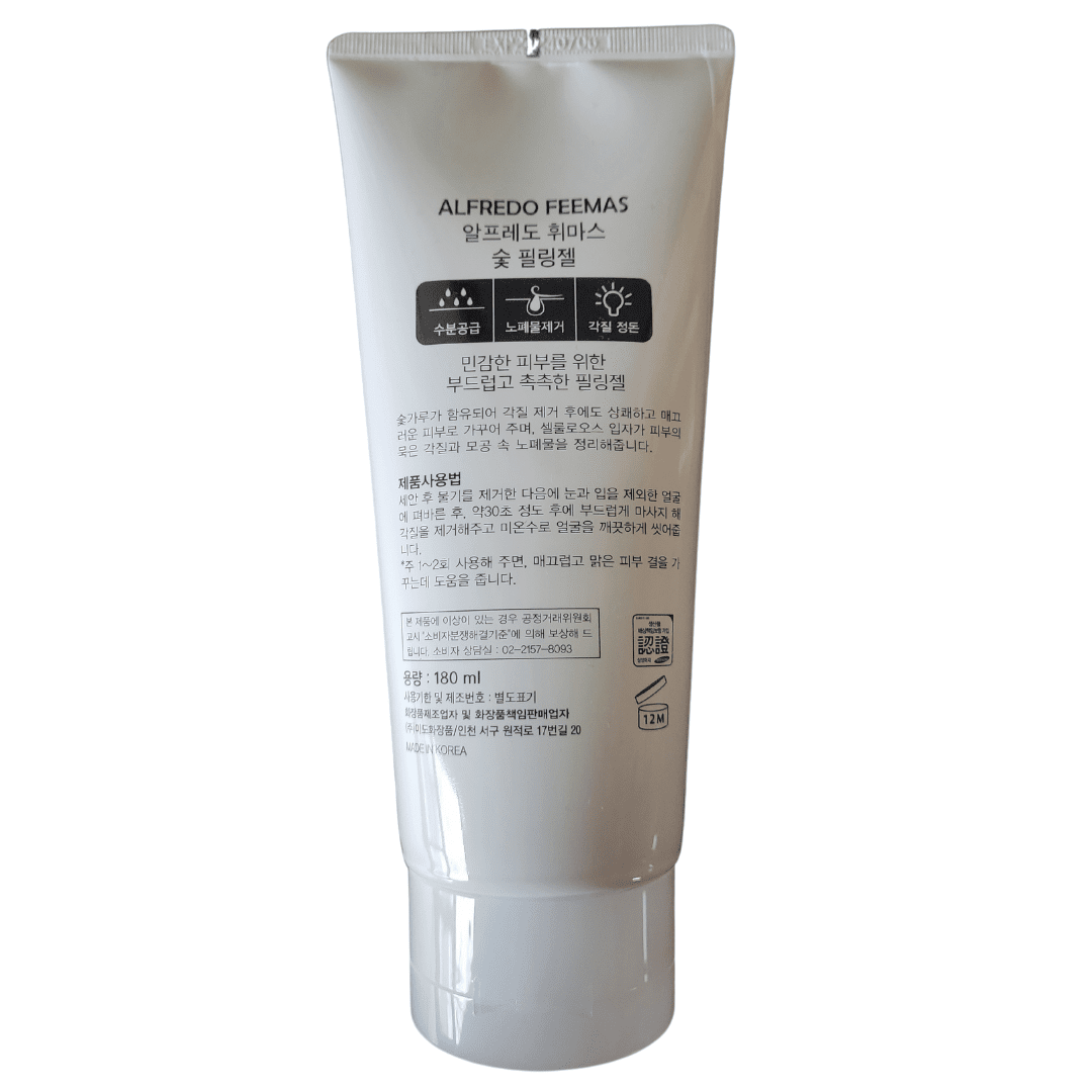Purified water, Glycerin, Steatrimonium methosulfate, Denatured alcohol, Butylene glycol, Carbomer, 1,2-hexanediol, walnut. No-fruit peel powder, Walnut seed shell extract, Charcoal powder, Green tea extract, Centella Asiatica extract, Aloe vera leaf extract, Cellulose, Fragrance.