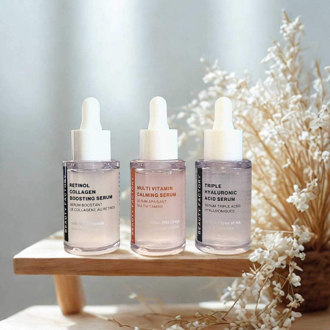 Beauty Factory Triple Serum Set offers a comprehensive skincare solution by combining key ingredients to target various concerns in one product or as part of a multi-step routine.